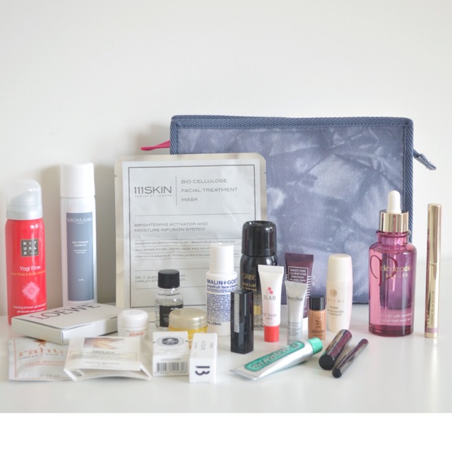 La Mer精华乳霜0.11oz($18.7);Rituals太极沐浴露50ml($3.7);Sachajuan干发喷雾75ml正装($20);Sisley玫瑰面膜中样10ml($27);纪梵希禁忌之吻唇膏23号中样($13);111SKIN亮白面膜($32);Oribe干发喷雾43ml($6.6);3Lab M面霜6ml($29);Natura Bisse钻石眼霜3ml($26.2);Marvis薄荷牙膏10ml($1.6);dacines面油12ml($9.6);Oribe黄金发膜中样($6.5);契尔氏焕彩面霜7ml($7.3);YSL睫毛膏2ml($9.6);Kevyn Aucoin 唇线笔中样.69g($14.2);Tatcha清洁面油($4.8);NARS阴影4ml($5.3);Malin+Goetz洁面中样1oz($4.2);Rahua发膜10ml($5.4);Replic周日早晨($6)、Byredo郁金香($6)、Diptyque 水中影2ml($3.6)、Loewe香水小样001男士香水2ml,女士香水2ml($7.2);扎染感化妆包。