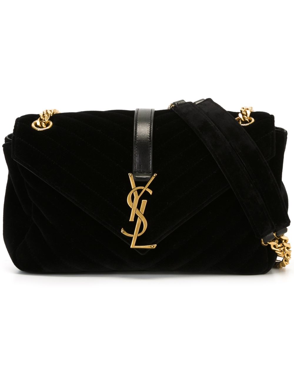 - Black leather and velvet medium 'Monogram' shoulder bag from Saint Laurent featuring a chain shoulder strap, gold-tone hardware, a front logo plaque, a foldover top with magnetic closure, an internal logo stamp, an internal patch pocket, an internal logo plaque and a quilted effect.