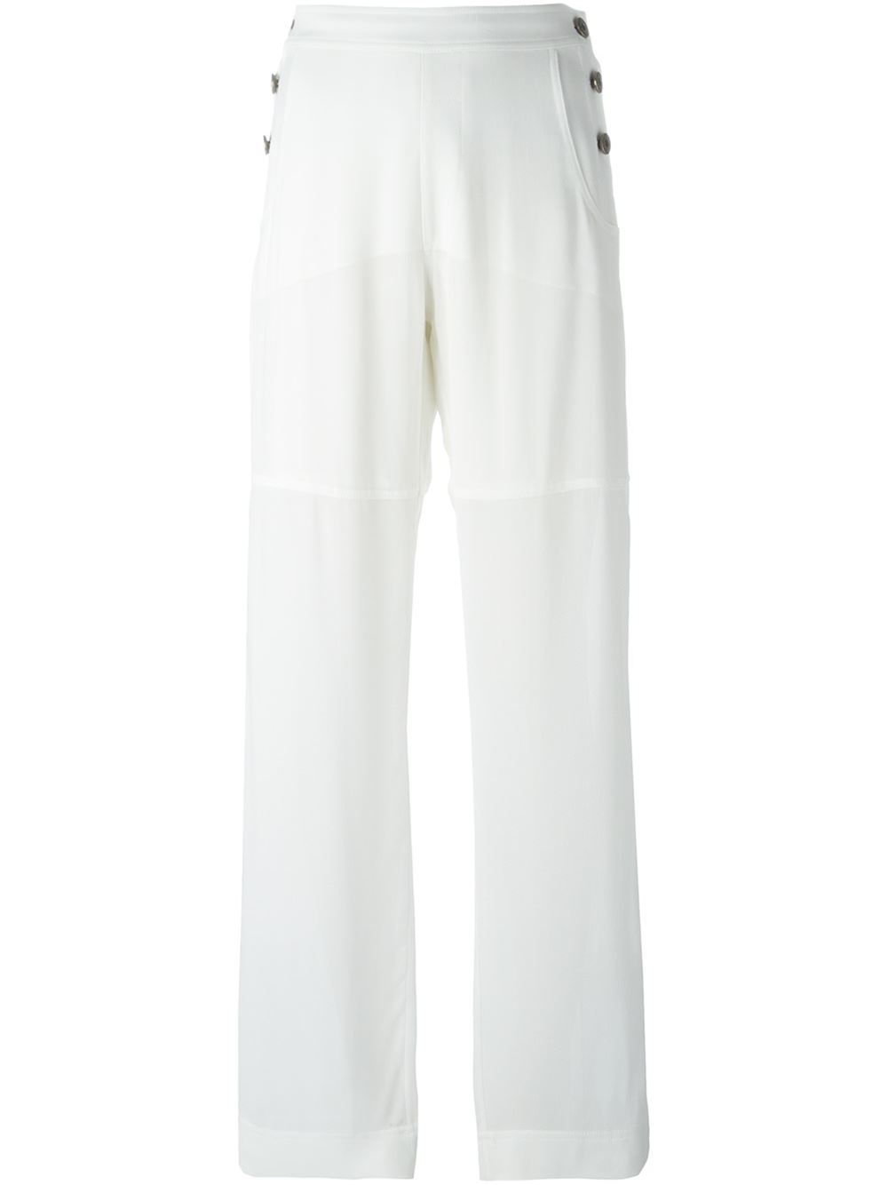- Chloé 牛奶白色 绉纱裙裤。 高腰, 两侧饰有内置口袋, 侧置纽扣, 阔腿, 一般长度, 后置两个贴袋。这件商品尺码适中。