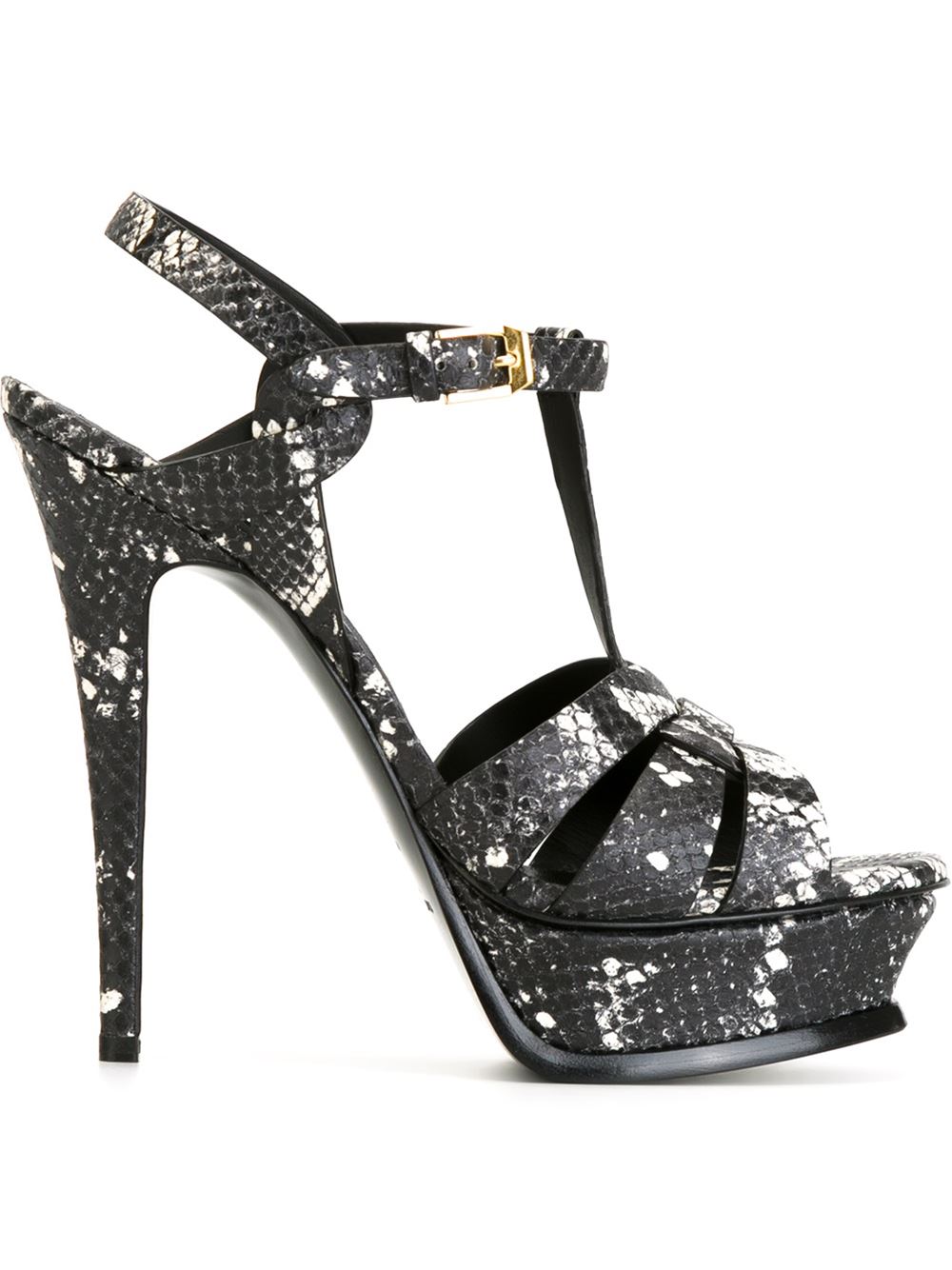 - Saint Laurent 黑色与白色 牛皮 'Classic Tribute 105'凉鞋。 露趾, 蛇皮效果, T字鞋带, 搭扣踝带, 细高跟, 厚鞋底。
