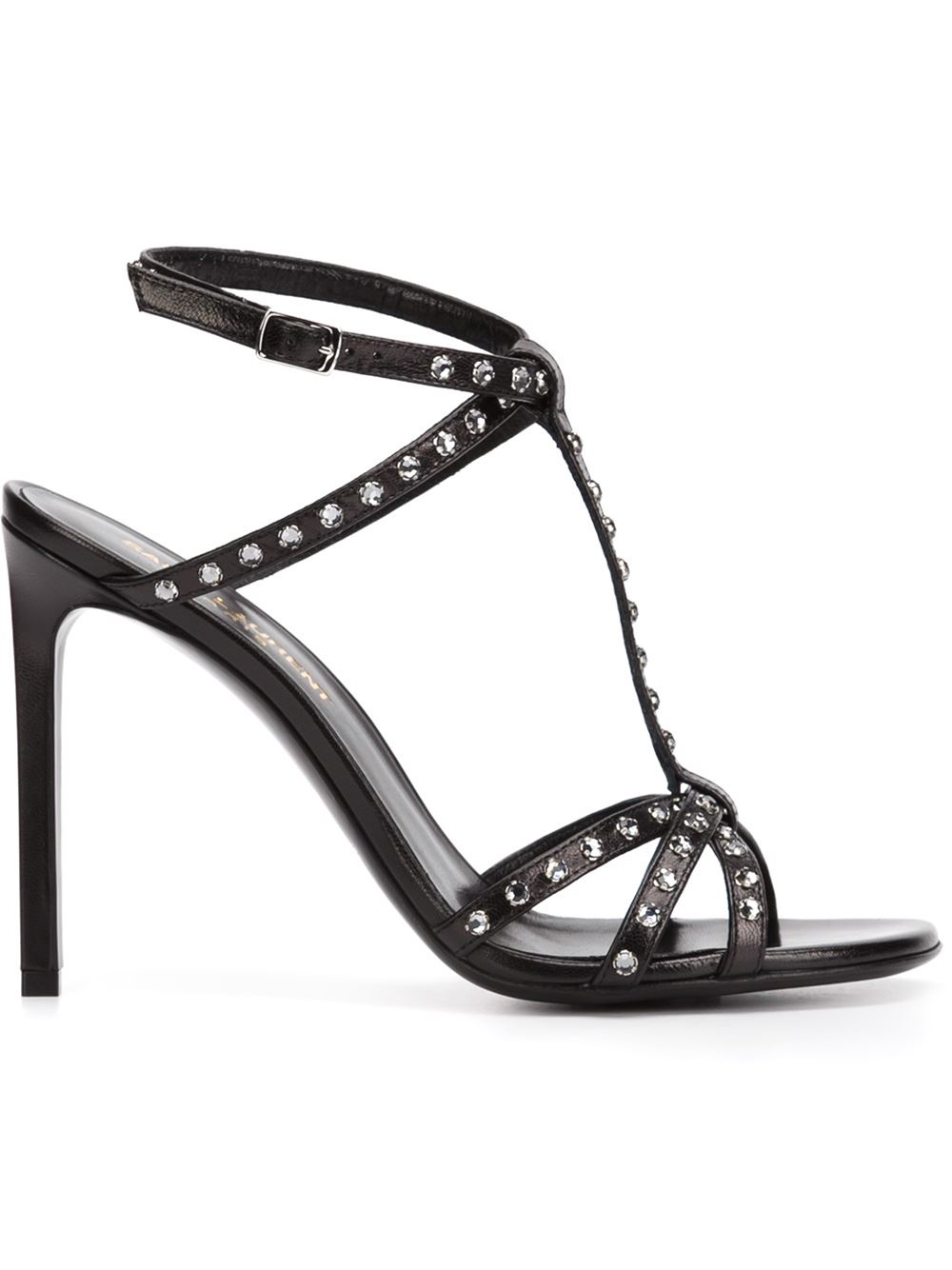 - Saint Laurent 黑色 牛皮 'Nu Pieds'凉鞋。 多带设计, 正面有T字形鞋带, 搭扣踝带, 银色铆钉, 鞋垫饰有品牌浮雕, 细高跟。