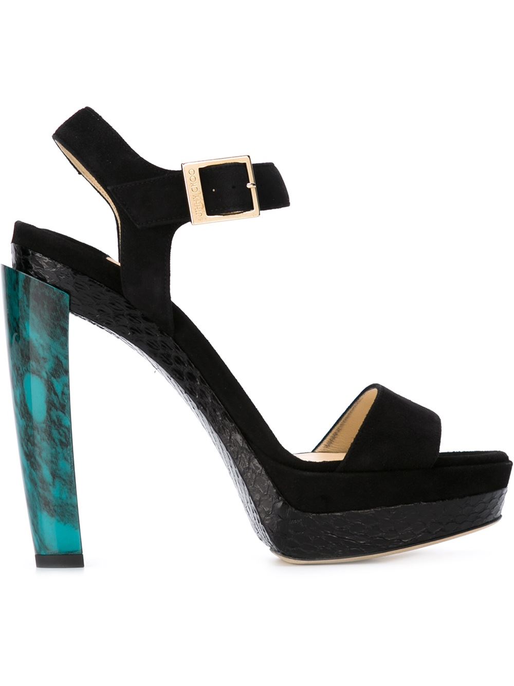 - Jimmy Choo 黑色 绒面皮 'Dora'凉鞋。 露趾, 鞋垫饰有品牌浮雕, 搭扣踝带, 厚鞋底。