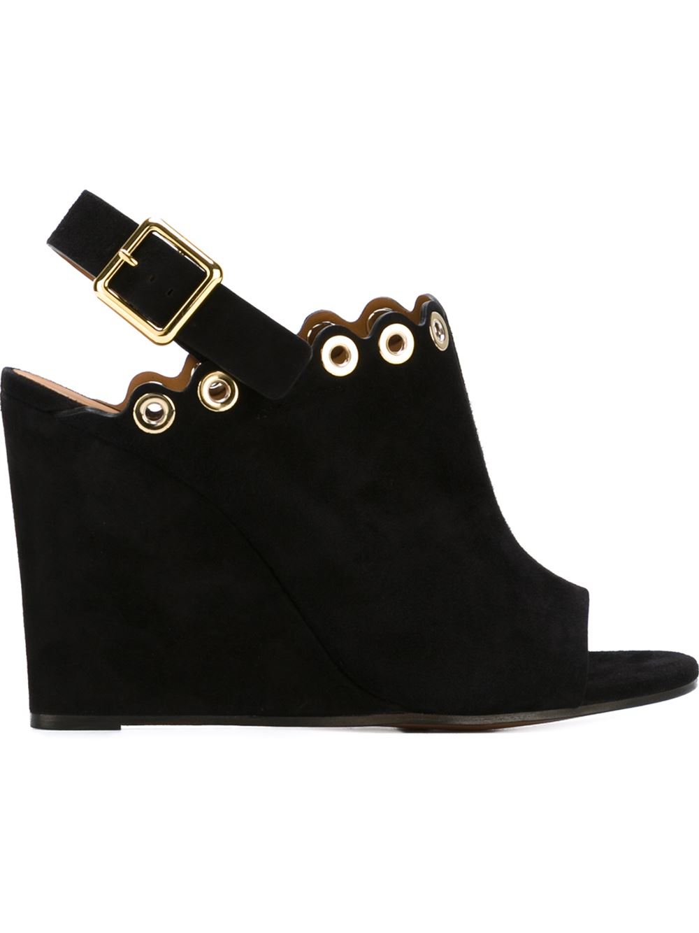 - Chloé 黑色 牛皮 坡跟凉鞋。 露趾, 裹踝鞋带, 饰扣眼, 鞋垫饰有品牌浮雕, 金色五金配件, 高跟。