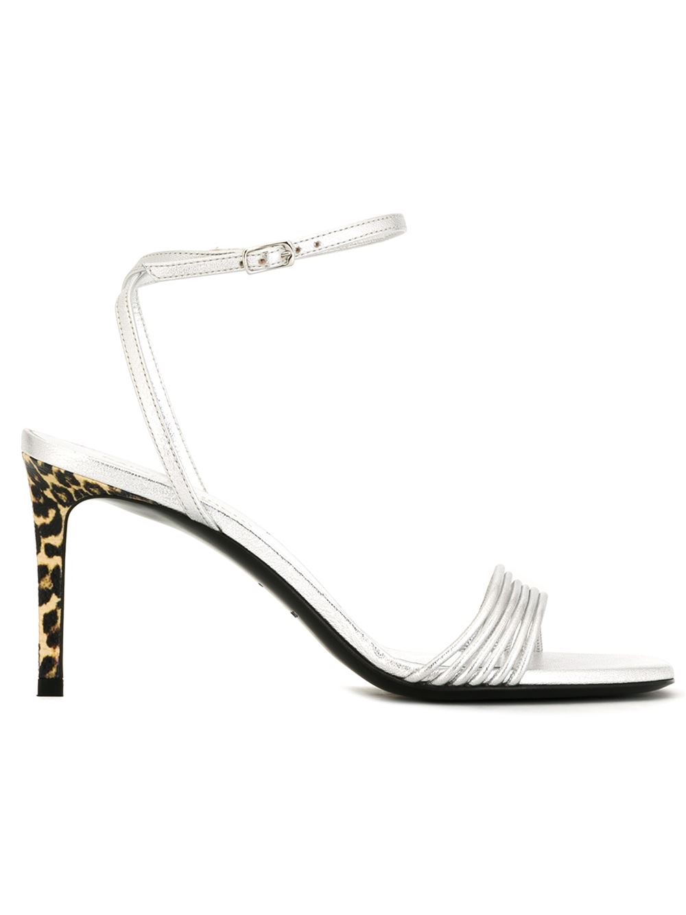 - Saint Laurent 银色 牛皮 'Kate'凉鞋。 露趾, 鞋垫饰有品牌标识, 搭扣踝带, 中高细跟, 豹纹。