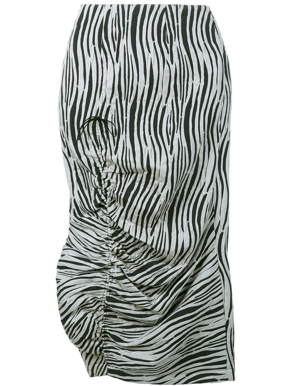 - This black and white A.W.A.K.E zebra print midi skirt is from the brand's energetic SS '16 collection which drew inspiration from the head designer's spirit animal. Constructed in the UK from a comfortable cotton-blend, this skirt has been tailored to a straight fit which boasts a feminine silhouette. An all-over black and white zebra print complete with a self-tie ruched detailing at the front imbues the piece with an exotic feel while the shape keeps it smart. Style yours with a a short sleeve black top and suede sandals for a striking off-duty look.