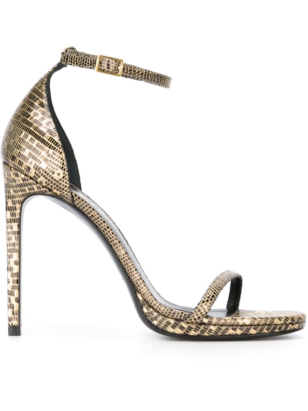 - Saint Laurent 金色与黑色 牛皮 'Jane'凉鞋。 露趾, 正面的带饰有开衩, 搭扣踝带, 蜥蜴皮效果, 鞋垫饰有品牌标识, 细高跟。