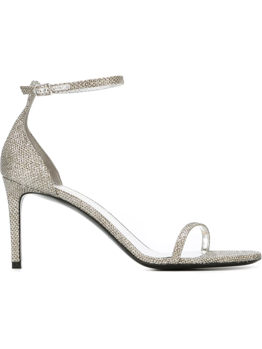 - Saint Laurent 银色 牛皮 'Jane'凉鞋。 露趾, 金葱胶细节, 搭扣踝带, 鞋垫饰有品牌浮雕, 细高跟, 皮革质鞋底。