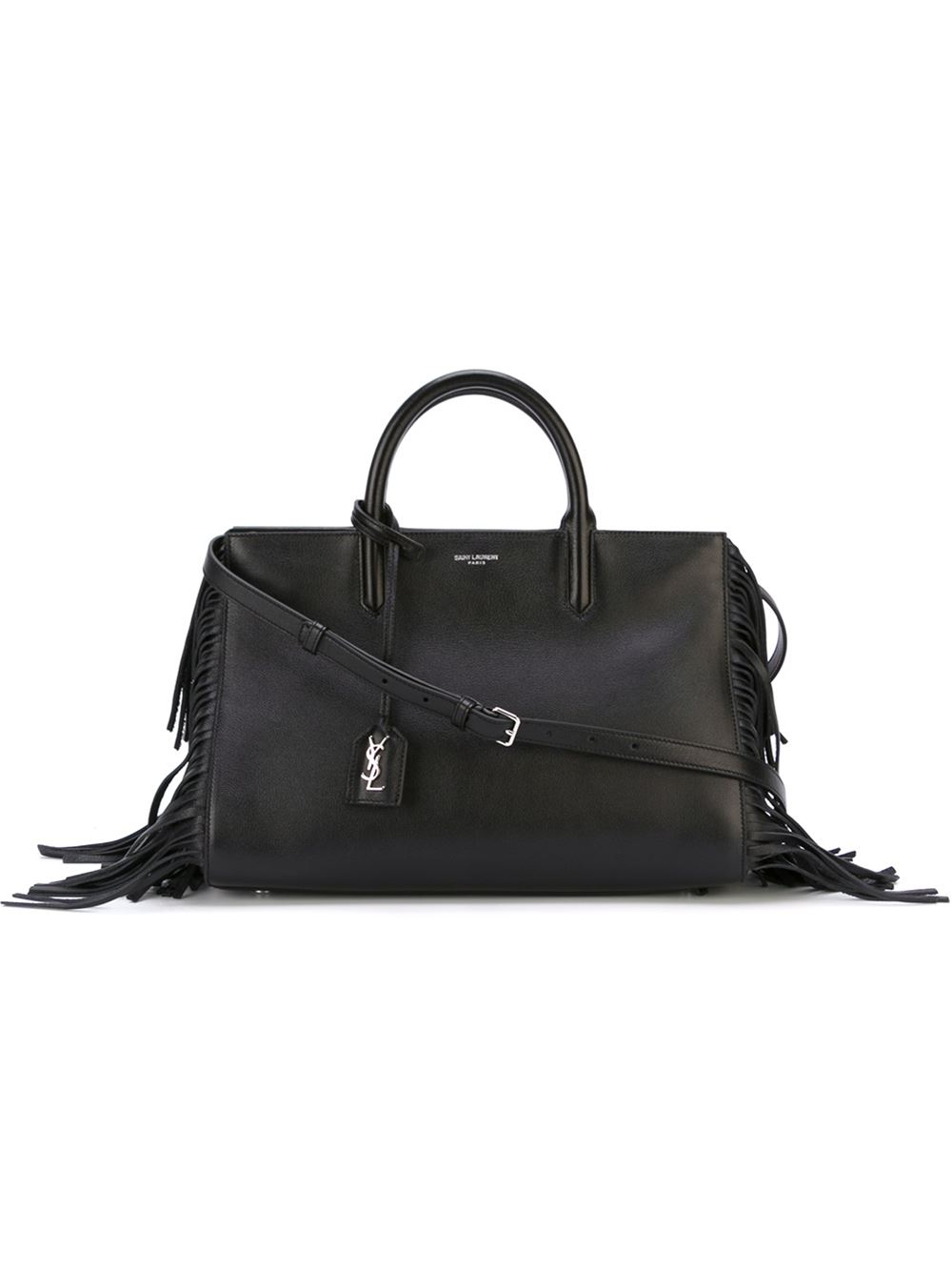- Saint Laurent 黑色 牛皮 'Rive Gauche'中号手提包。 顶部有弧状手柄, 正中有品牌标记, 流苏边, 皮质吊牌, 可拆卸可调肩带, 顶置拉链, 脚钉。