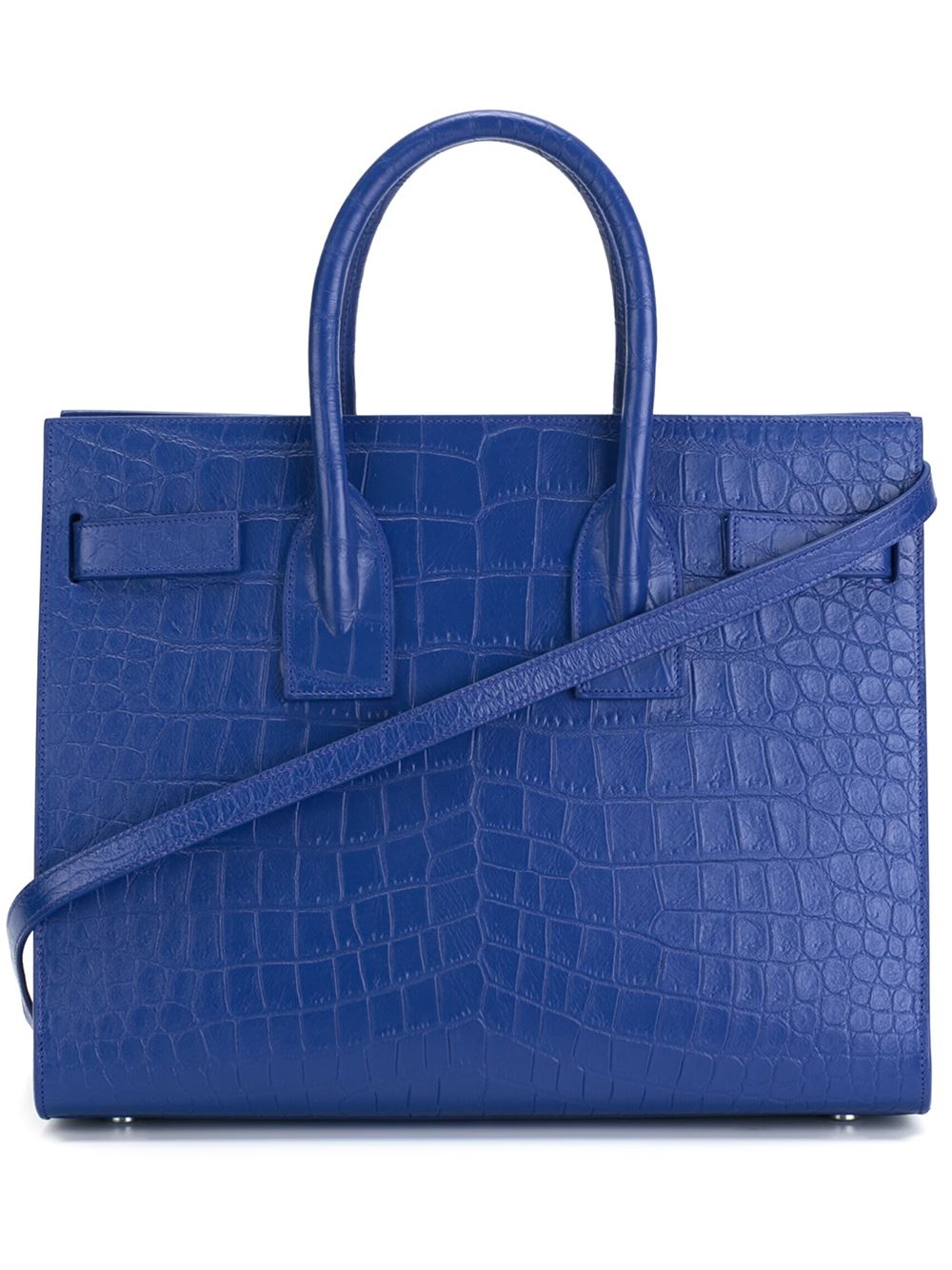 - Saint Laurent 蓝色 小牛皮 'Sace de Jour'小号手提包。 长方形, 无开合设计, 顶部有弧状手柄, 可拆卸可调肩带, 带浮雕及鳄鱼皮效果, 银色五金配件, 内置拉链口袋。