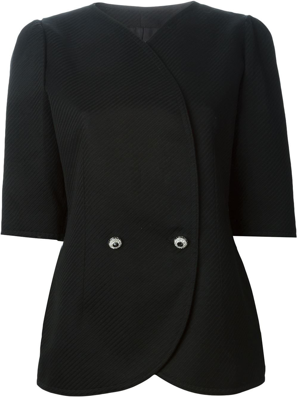 - Jean Louis Scherrer Vintage 黑色 纯棉 曲线形设计夹克。 V领, 正面有双排扣, 短袖, 肩垫, 罗纹设计, 平直下摆。请注意,古着(vintage)商品并非新的,因此可能有轻微的瑕疵。