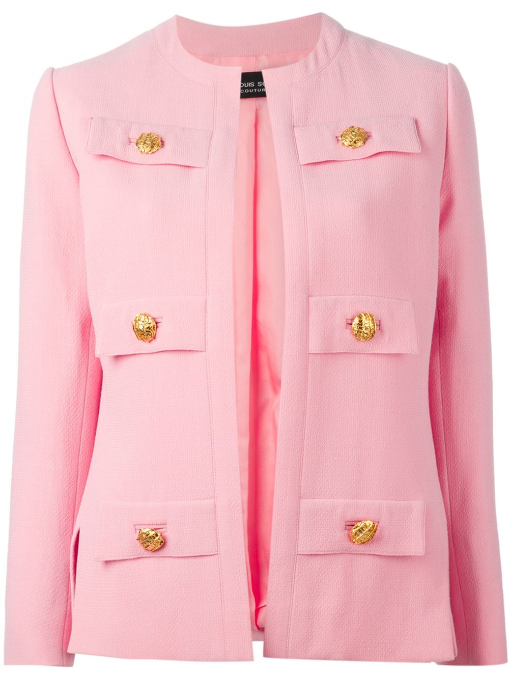 - Jean Louis Scherrer Vintage 浅粉色 多口袋夹克。 无领设计, 开襟, 两个正面盖袋, 长袖, 搭扣袖口, 平直下摆。请注意,古着(vintage)商品并非新的,因此可能有轻微的瑕疵。