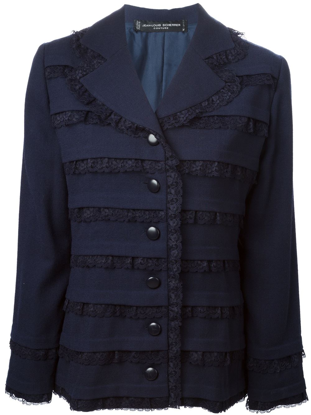 - Jean Louis Scherrer Vintage 深蓝色 羊毛 蕾丝拼接夹克。请注意,古着(vintage)商品并非新的,因此可能有轻微的瑕疵。