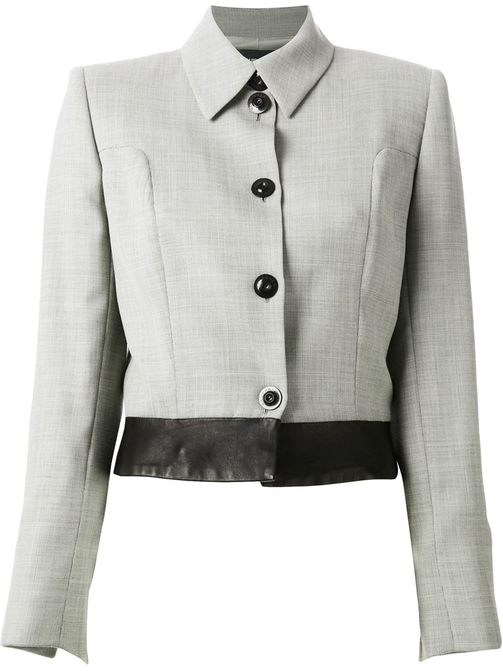 - Jean Louis Scherrer Vintage 黑色及灰色 羊毛混纺 短款夹克。 经典衣领, 长袖, 正面纽扣, 短款。请注意,古着(vintage)商品并非新的,因此可能有轻微的瑕疵。