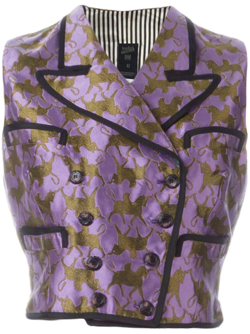 - Jean Paul Gaultier Vintage 紫色与黑色 丝绸 'Le Grand Voyage'西式马甲。 尖翻领, 两个正面口袋, 正面有双排扣, 短款, 后置调整系带, 独角兽与斗牛印花。这件商品源自于1970年代期间。请注意,古着(vintage)商品并非新的,因此可能有轻微的瑕疵。状态良好。