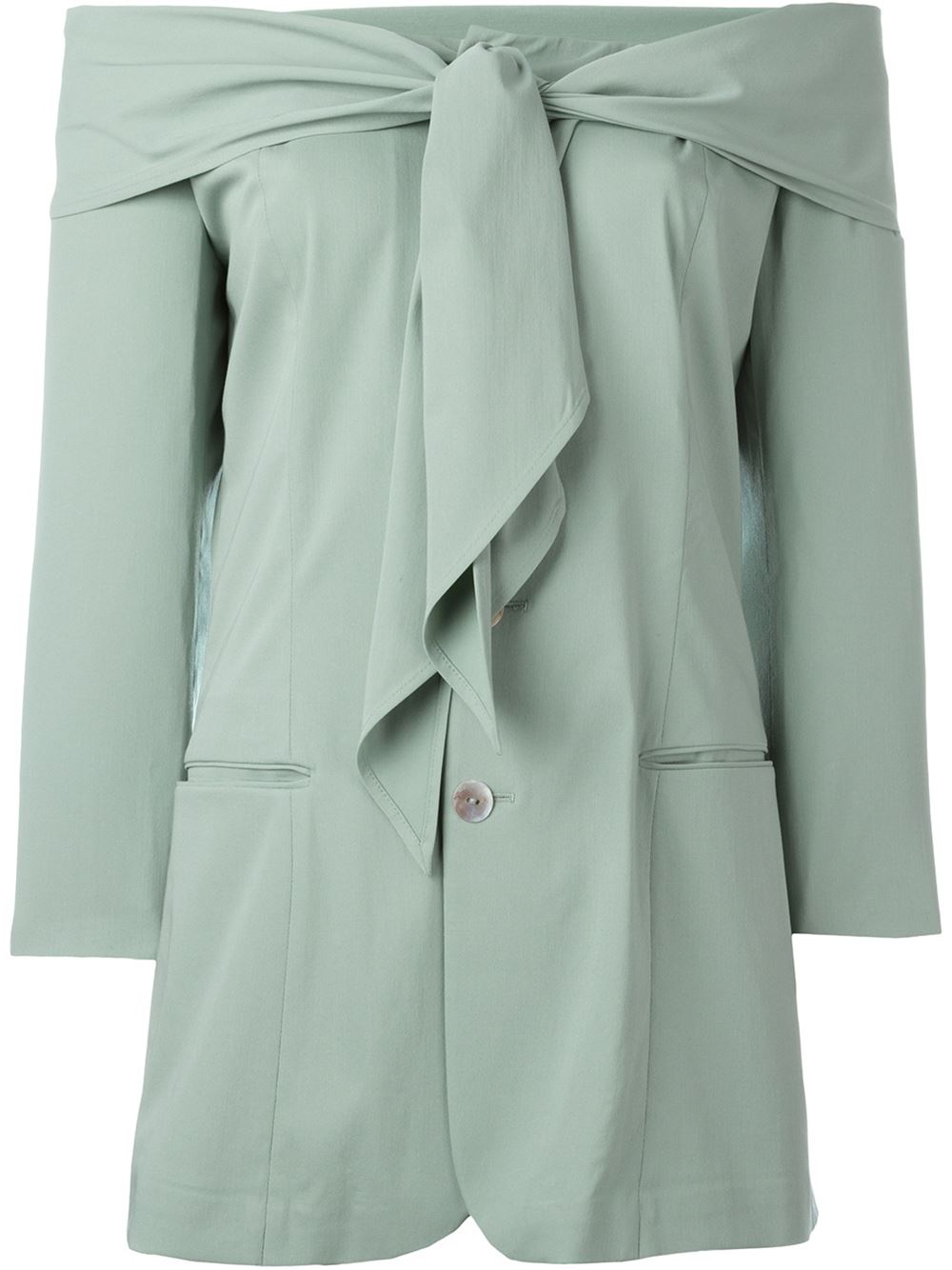 - Jean Paul Gaultier古着 绿色 羊毛混纺 古着露肩结饰夹克。 正面纽扣, 正面平袋, 长袖。这件商品源自于1980年代期间。请注意,古着(vintage)商品并非新的,因此可能有轻微的瑕疵。