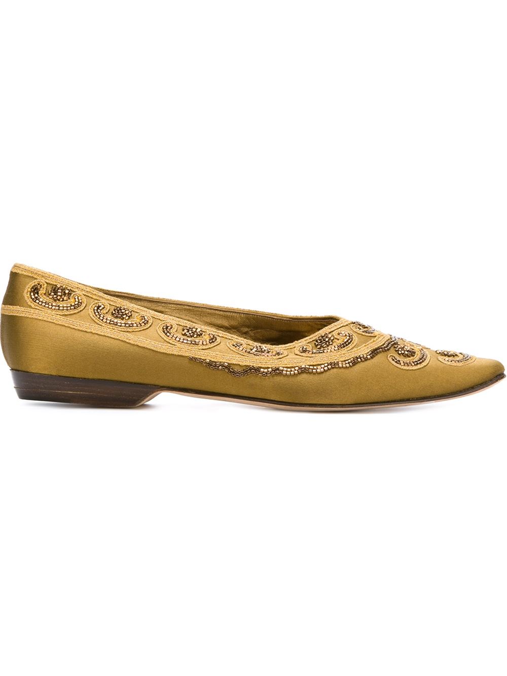 - Prada古着 浅褐色 牛皮与丝绸 古着镶嵌平底鞋。 杏仁形鞋尖, 珠绣, 鞋垫饰有品牌标识, 低跟。这件商品源自于1990年代期间。请注意,古着(vintage)商品并非新的,因此可能有轻微的瑕疵。