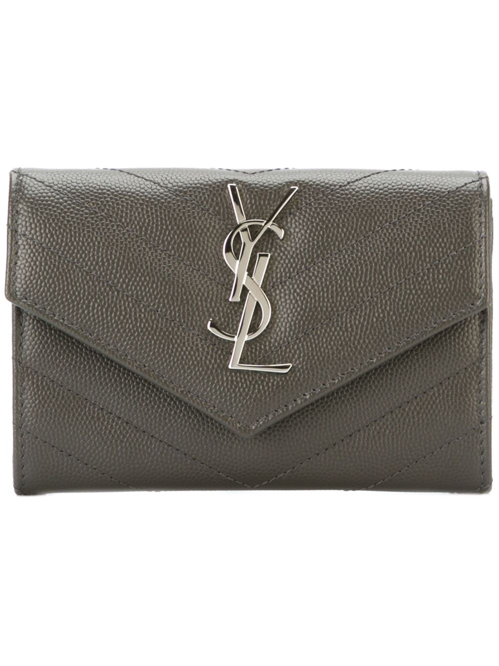 - Saint Laurent 灰色 小牛皮 'Collège Monogram'钱包。 银色标牌, 顶部饰有翻盖, 摁扣, 内置多个卡槽。