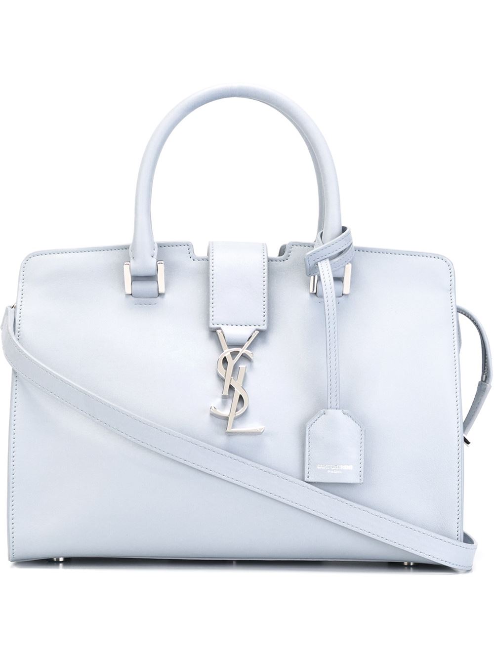 - Saint Laurent 浅蓝色 小牛皮 'Cabas Monogram'小号手提包。 顶部有拉链, 顶部有弧状手柄, 可拆卸可调肩带, 饰绑带, 正面标志贴, 银色五金配件, 皮质吊牌, 可拆卸口袋。