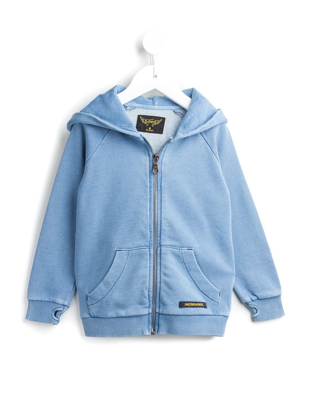 - Finger in the nose 浅蓝色 全棉 水洗效果连帽衫。 抽绳兜帽, 正面拉链, 长袖, 罗纹底边及袖口, 正中央有一个平袋, 正面标贴。
