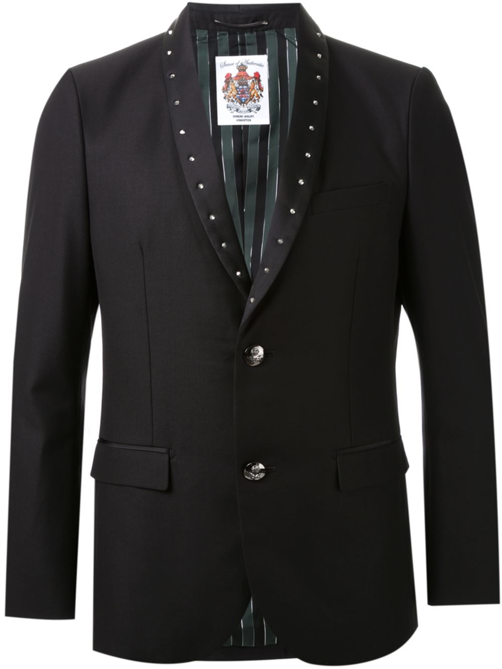 - Education from Youngmachines 黑色 铆钉翻领西装夹克。 胸袋, 正面竖排钮扣及开合, 正面口袋, 曲线形底边。