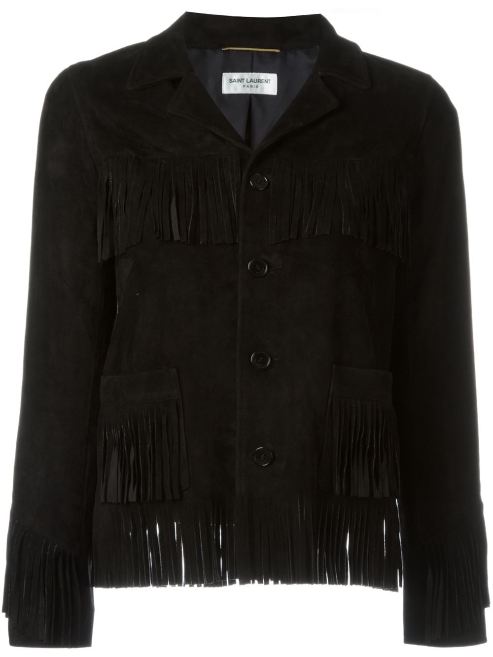 - Saint Laurent 黑色 丝绸与山羊皮 'Curtis'夹克。 梯形翻领, 正面纽扣, 两个正面口袋, 流苏细节, 长袖, 平直下摆, 全衬里。这件商品尺码适中。