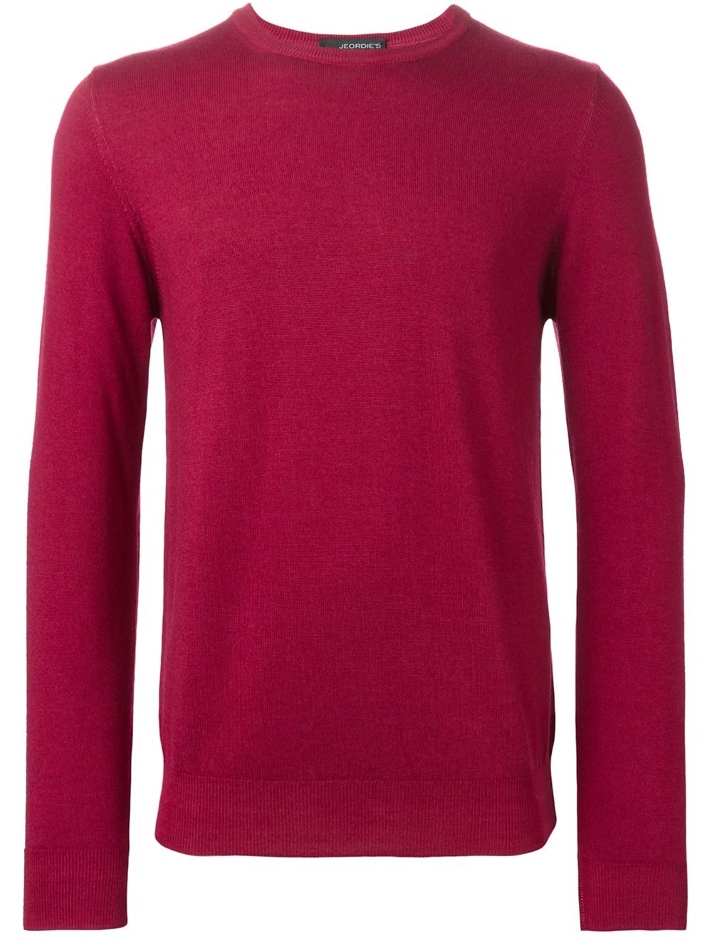 - Jeordie's 樱桃红 初剪羊毛 圆领毛衣。 圆领, 长袖, 罗纹底边与袖口。