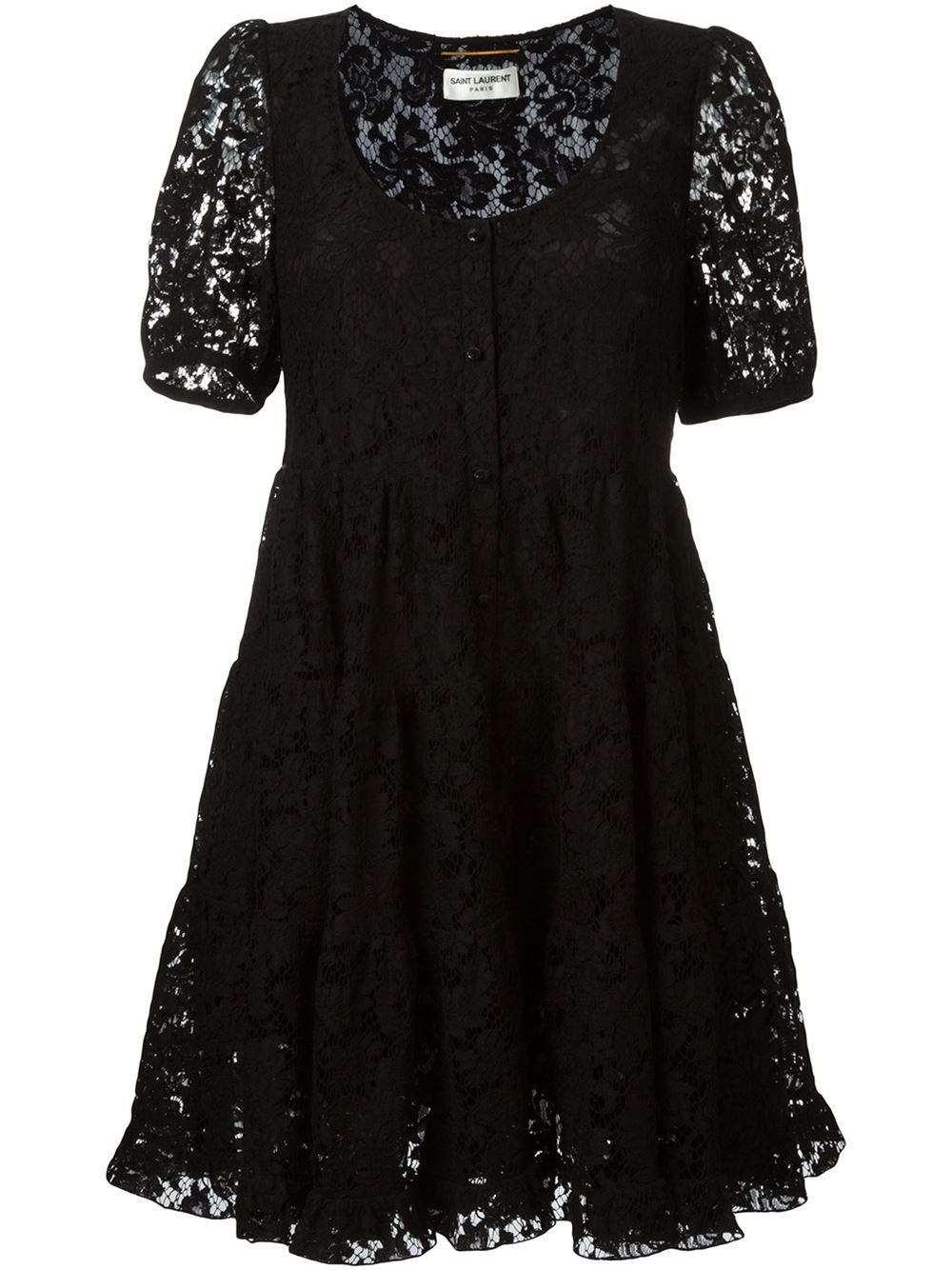 - Saint Laurent 黑色 棉质混纺与丝绸 花卉蕾丝伞摆连衣裙。 U字形领, 短袖, 正面竖排纽扣, A字形半身裙, 荷叶设计, 平直下摆。