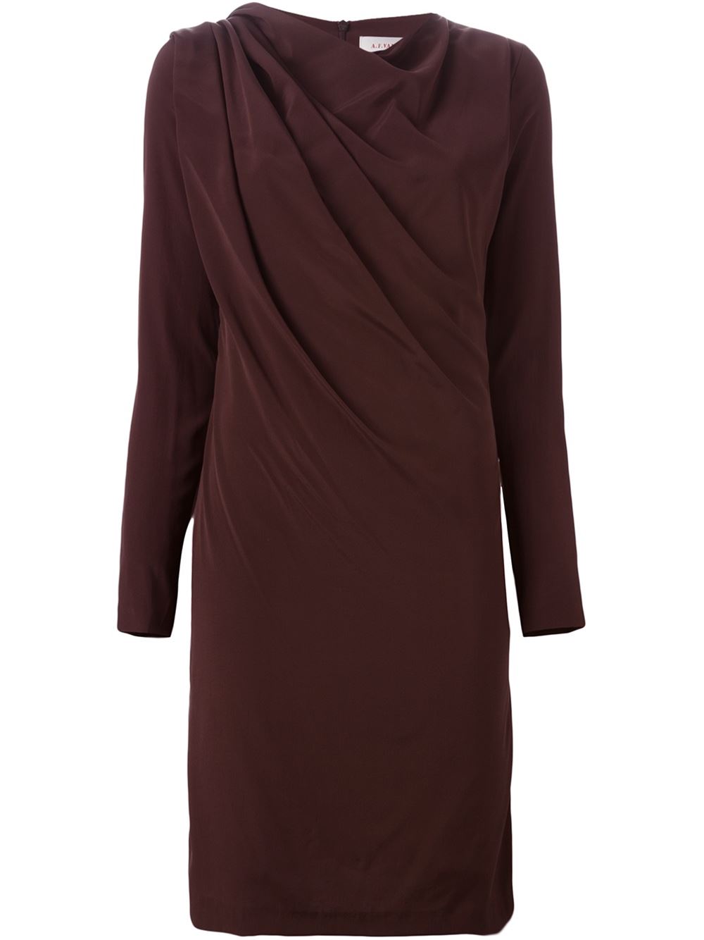 - A.F.Vandevorst 褐色 丝绸 '152 Demand'连衣裙。 圆领, 长袖, 垂褶设计, 后面有拉链, 中长。