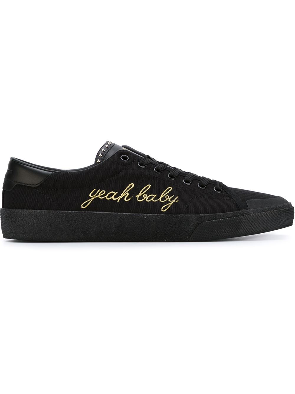 - Saint Laurent 黑色 全棉与牛皮 Yeah Baby板鞋。 圆头, 正面绑带, 鞋舌饰有品牌浮雕, 金色铆钉。