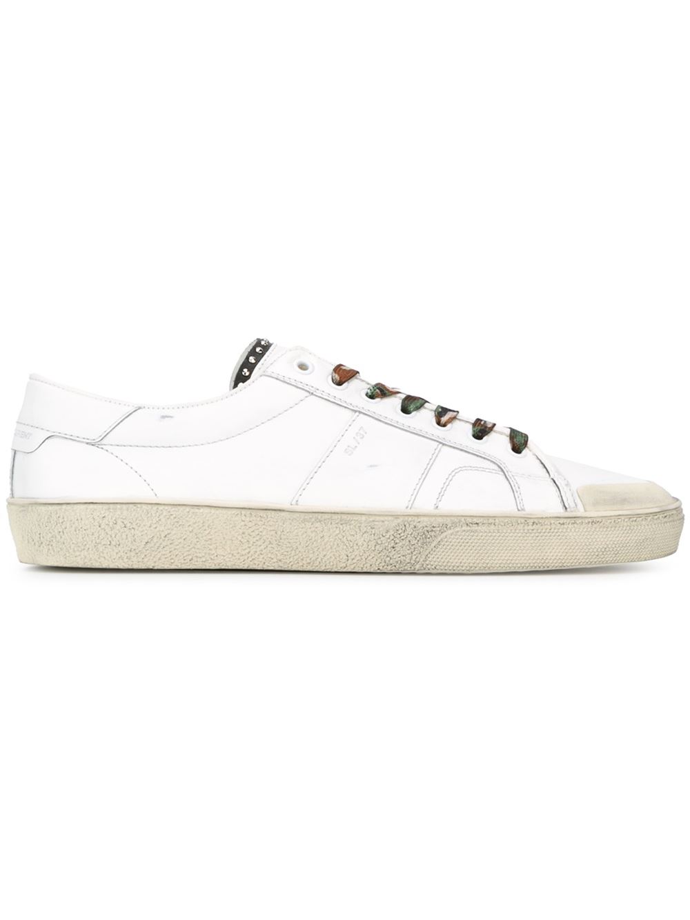 - Saint Laurent 米白色 小牛皮 'Court Classic Surf'板鞋。 圆头, 正面绑带, 鞋舌饰有品牌浮雕, 针脚细节, 仿旧效果, 平底橡胶鞋底。