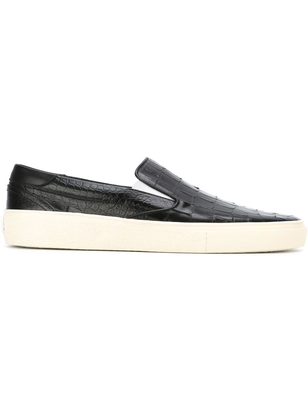 - Saint Laurent 黑色 牛皮 'Skate'无带板鞋。 穿套式, 带浮雕及鳄鱼皮效果, 圆头, 平底橡胶鞋底。
