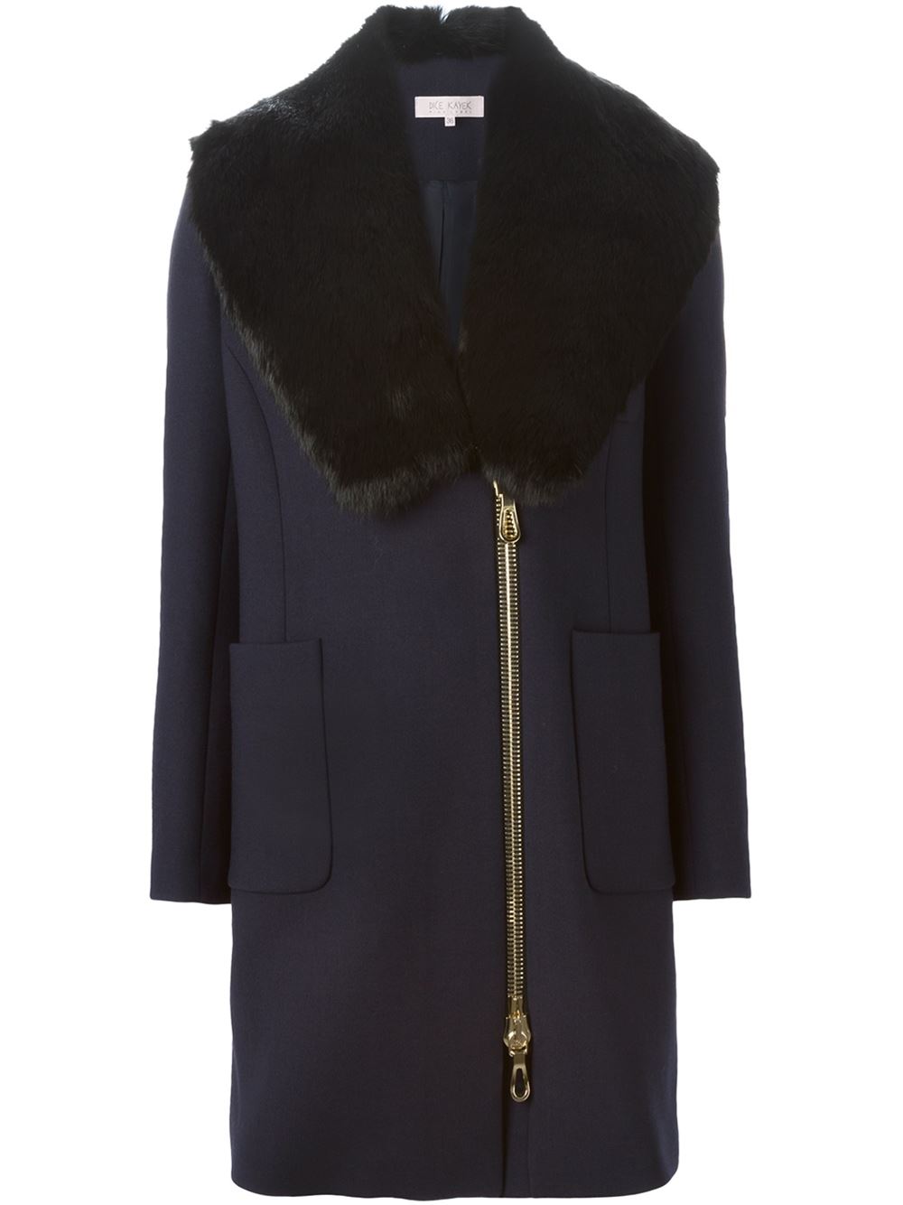 - Dice Kayek 海军蓝色 羊毛混纺 可拆式装饰品草领外套。 正面拉链, 两个正面口袋, 直筒腰。