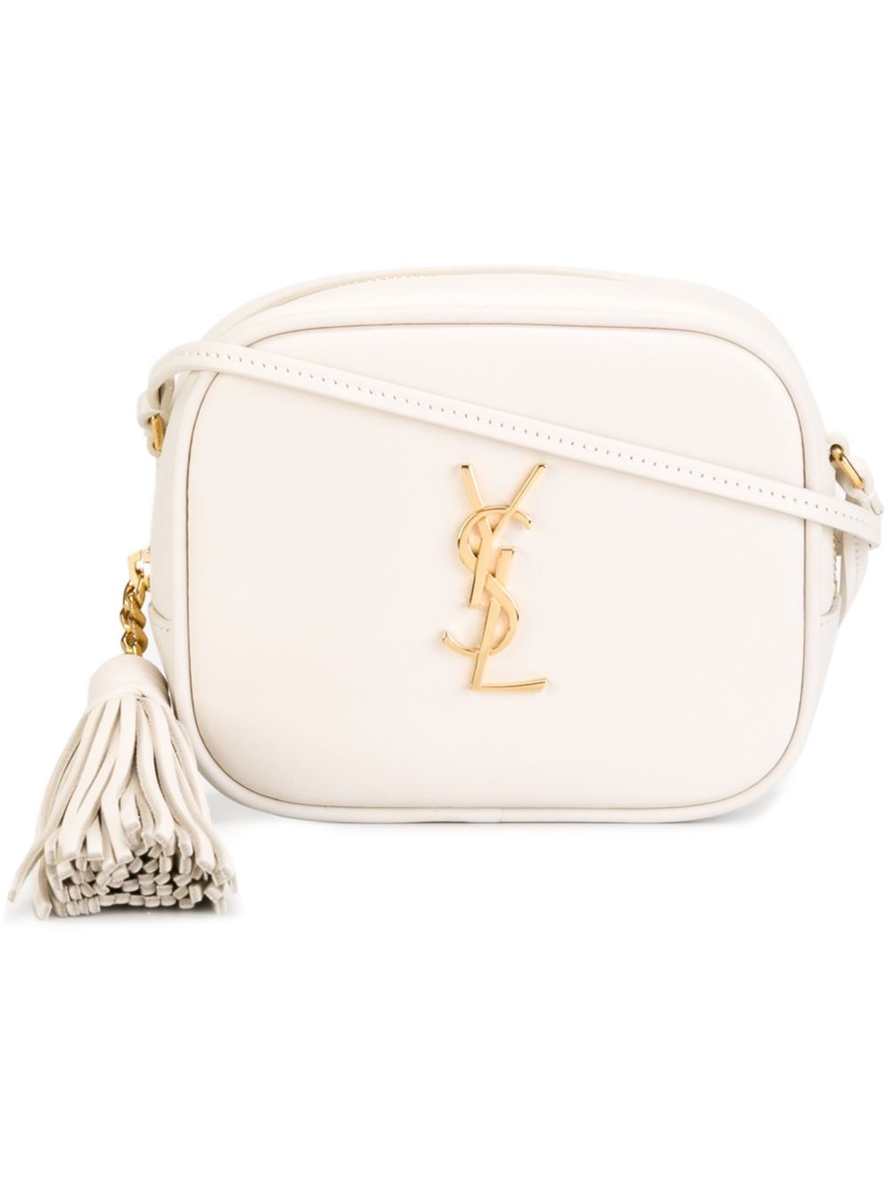 - Saint Laurent 白色 小牛皮 'Monogram Blogger'斜挎包。 肩带, 正面标志贴, 金色五金配件, 顶部有拉链, 流苏挂饰, 内置浮雕标记, 内置多个卡槽。