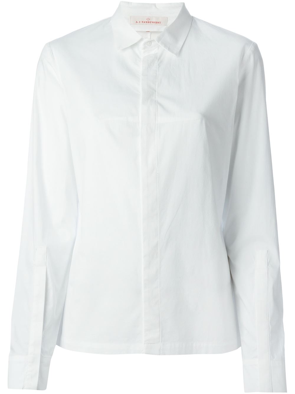 - A.F.Vandevorst 白色 弹性棉 '152 Curfe'衬衫。 经典衣领, 长袖, 暗扣, 搭扣袖口。