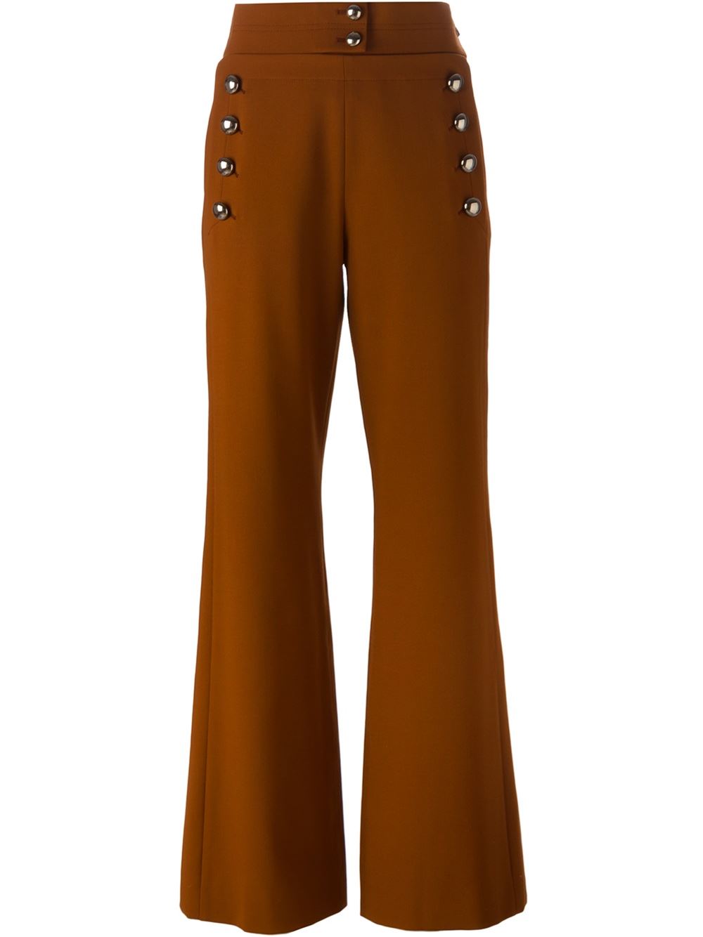 - Chloé 褐色 弹性初剪羊毛 阔腿喇叭裤。 高腰, 正面纽扣, 侧置口袋, 侧置纽扣, 阔腿。