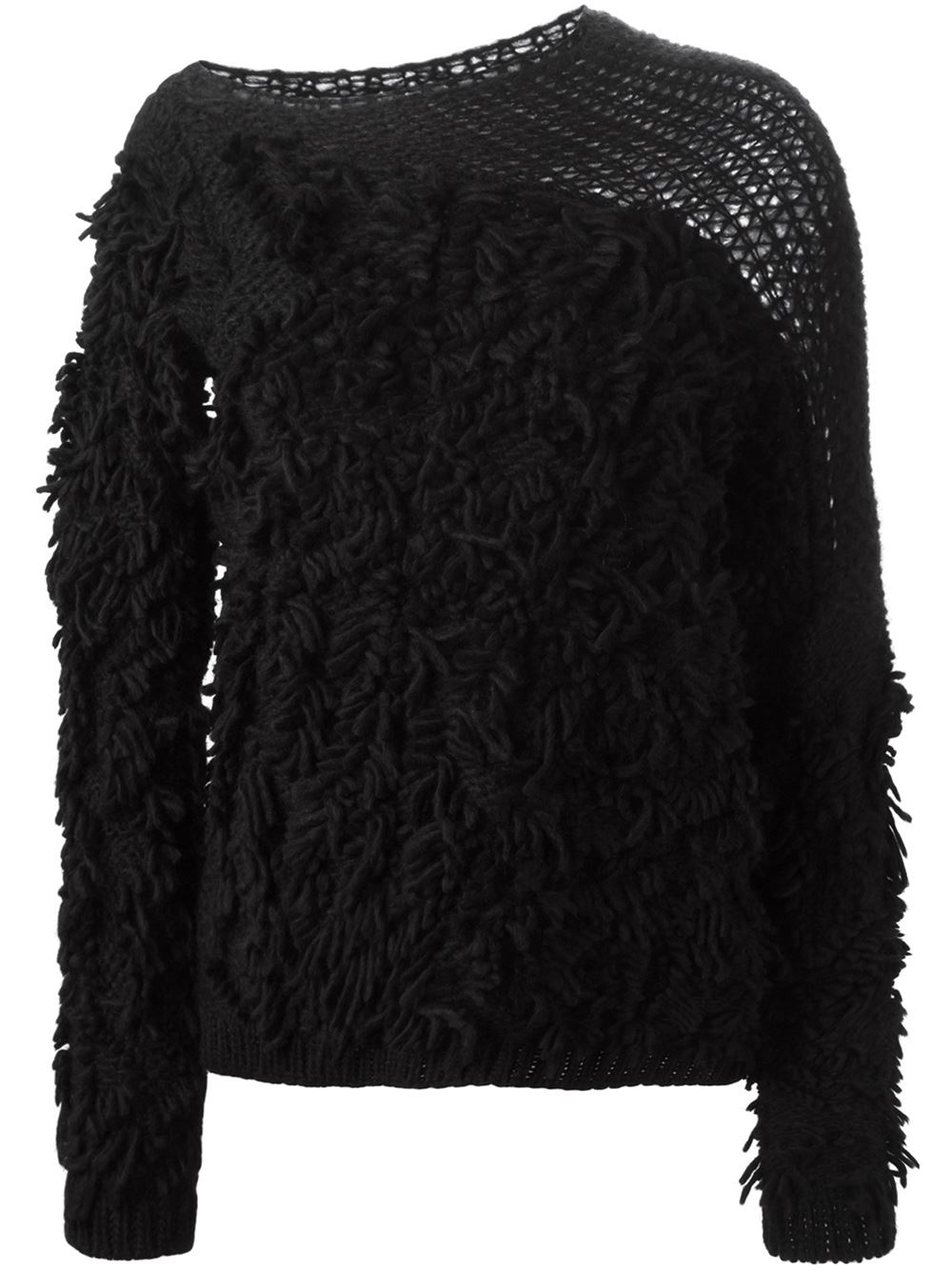 - A.F.Vandevorst 黑色 马海毛, 羊毛, 羊驼毛与剪羊毛混纺 '152 Tapa'流苏毛衣。 不对称领口, 长袖, 透视拼接面料, 罗纹细节。