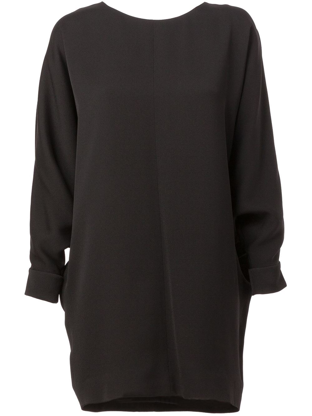 - Saint Laurent 黑色 丝绸 短款茧形连衣裙。 圆领, 阔七分袖, 后置拉链, 平直下摆。