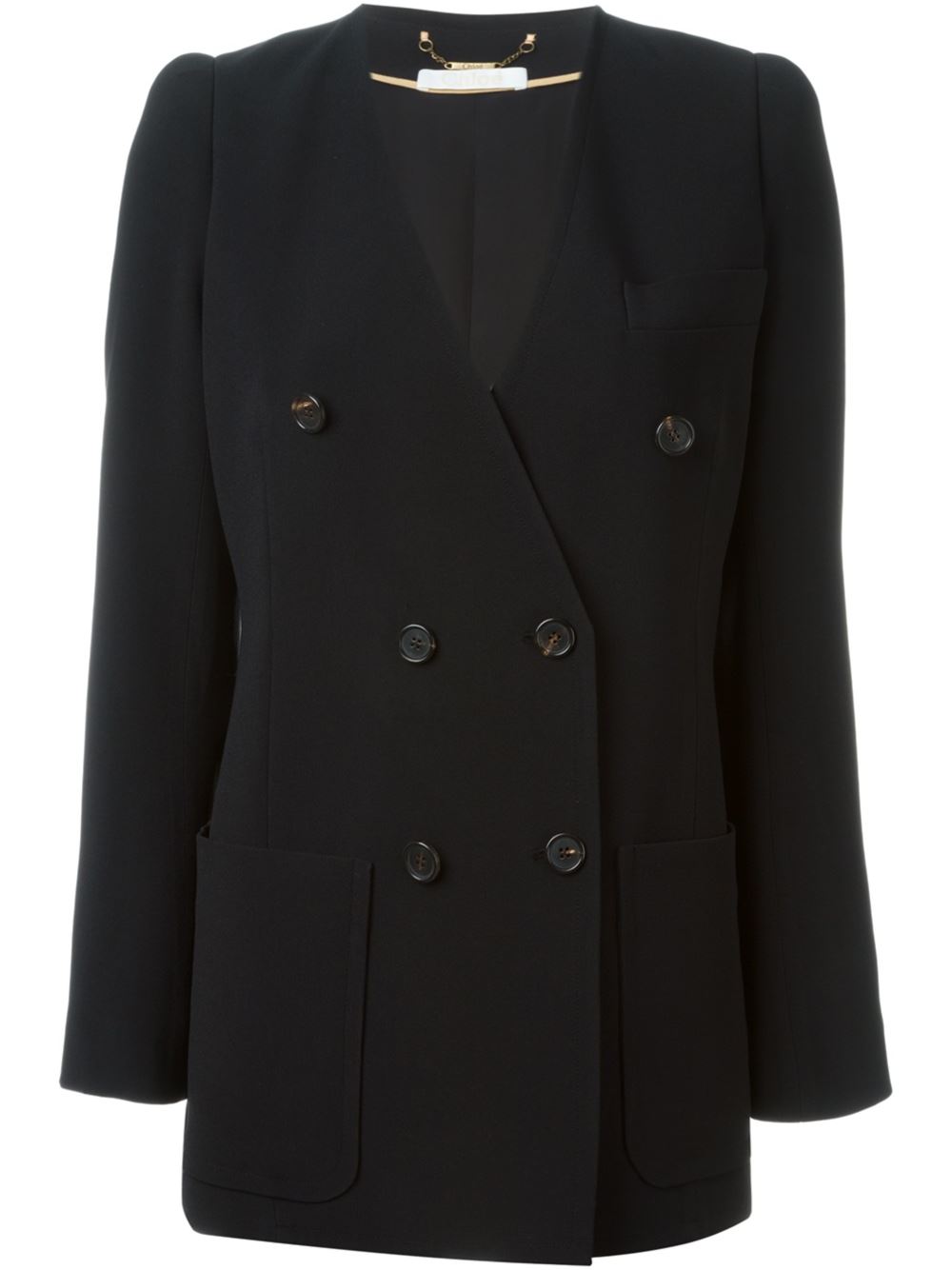 - Chloé 黑色 丝绸混纺 双排扣西装夹克。 V领, 长袖, 两个正面口袋, 中后背开衩, 圆形肩。