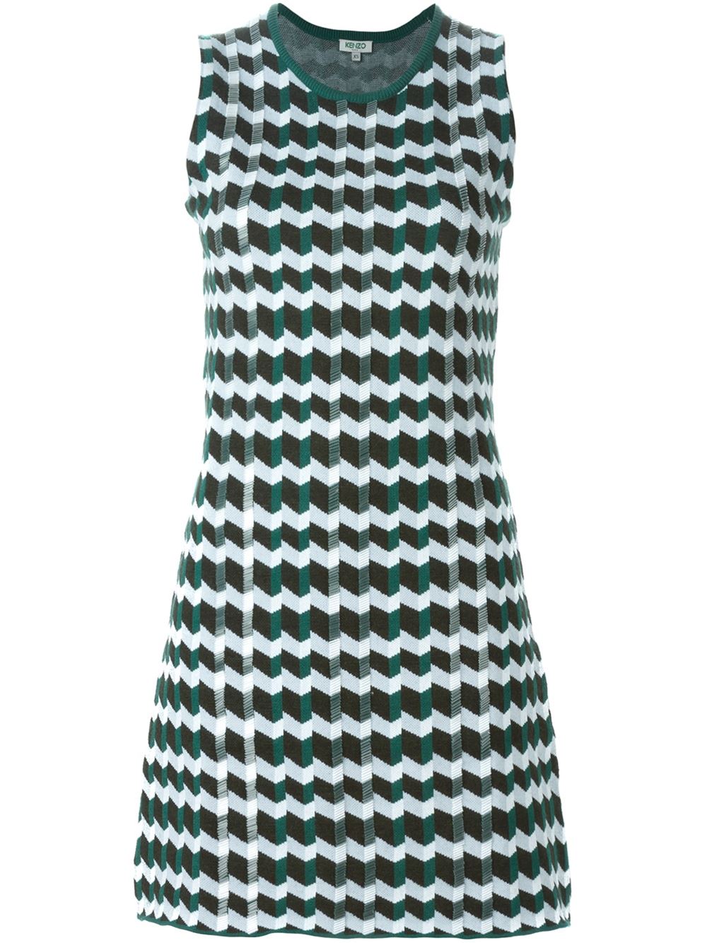 - Kenzo 绿色与白色 羊毛混纺 'Vichy'连衣裙。 罗纹针织圆领, 嵌花针织, 无袖设计, 短款。