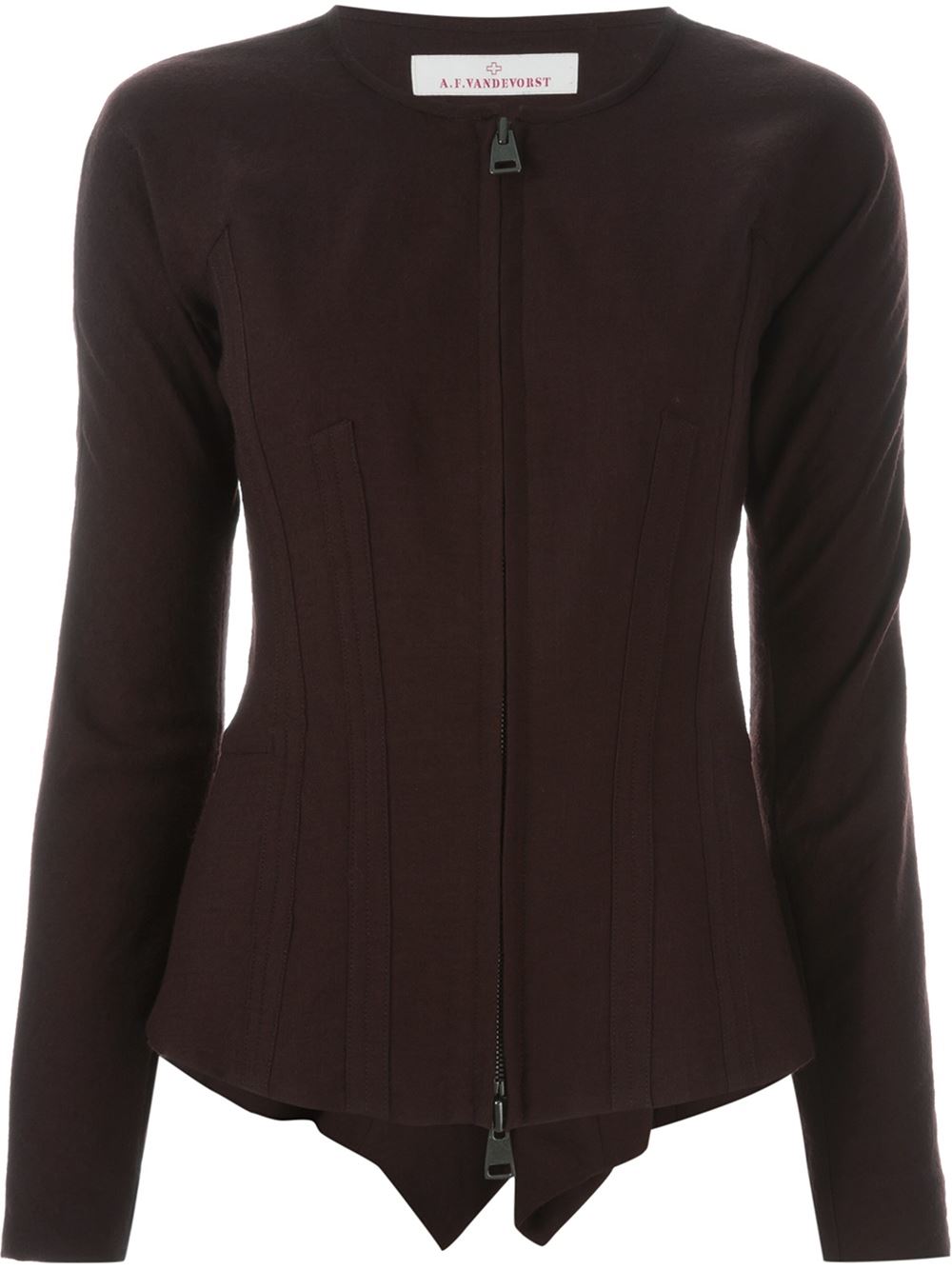 - A.F.Vandevorst 褐色 初剪羊毛 '152 Amazonian'拉链开衫。 圆领, 长袖, 束腰, 针脚细节。