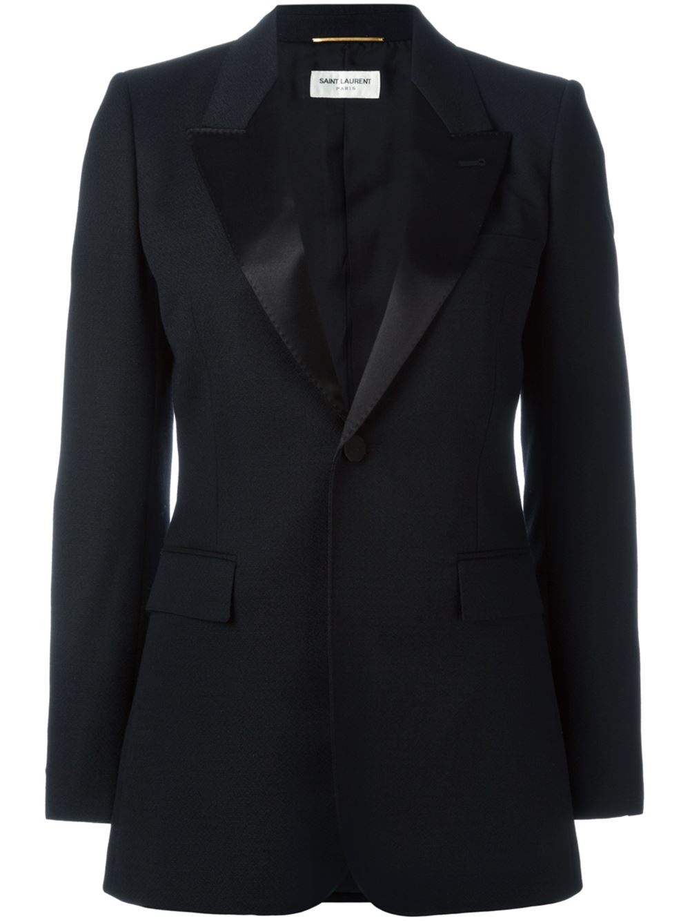 - Saint Laurent 黑色 丝绸全棉羊毛 'Iconic Le Smoking'夹克。 尖翻领, 正面纽扣, 胸袋, 两个正面盖袋, 长袖, 搭扣袖口, 中后背开衩, 全衬里。