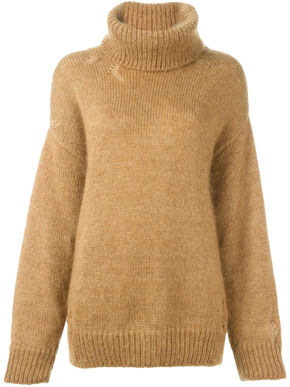 - Saint Laurent 驼色 马海毛 仿旧针织毛衣。 高领, 挎肩, 仿旧效果, 长袖, 罗纹底边及袖口, 宽松设计, 特大款。