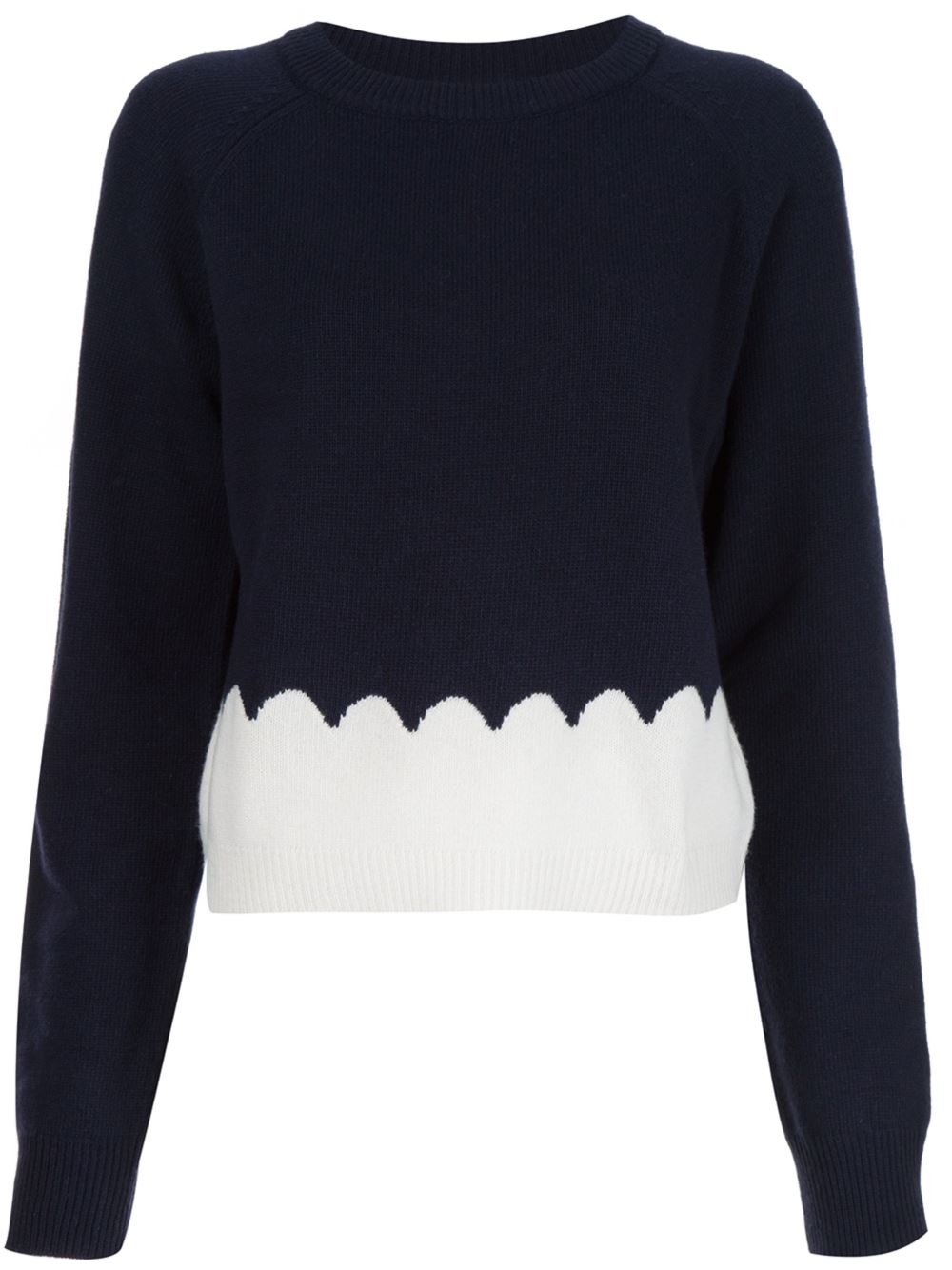 - Chloé 海军蓝色与白色 羊毛 扇贝形嵌花毛衣。 罗纹针织圆领, 双色设计, 长袖, 平直下摆, 罗纹底边及袖口。