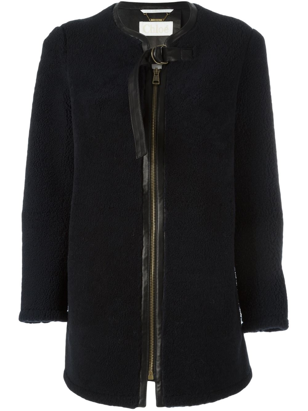 - Chloé 蓝色 小羊皮 无领外套。 圆领, 正面拉链, 正面扣, 皮革边饰, 侧身口袋, 长袖, 平直下摆。
