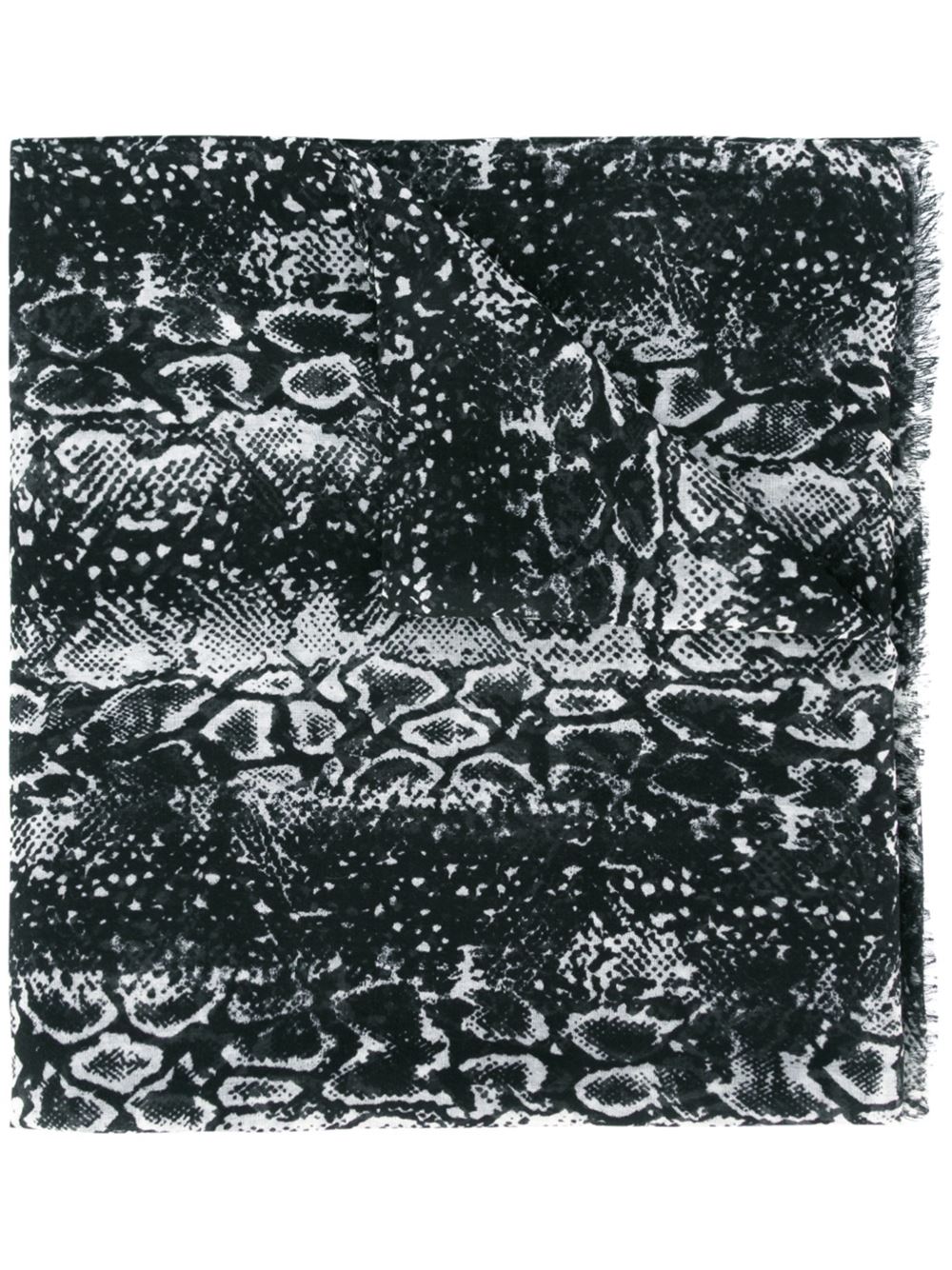 - Saint Laurent 黑色与白色 羊毛 蛇纹围巾。 流苏边, 标志印花。
