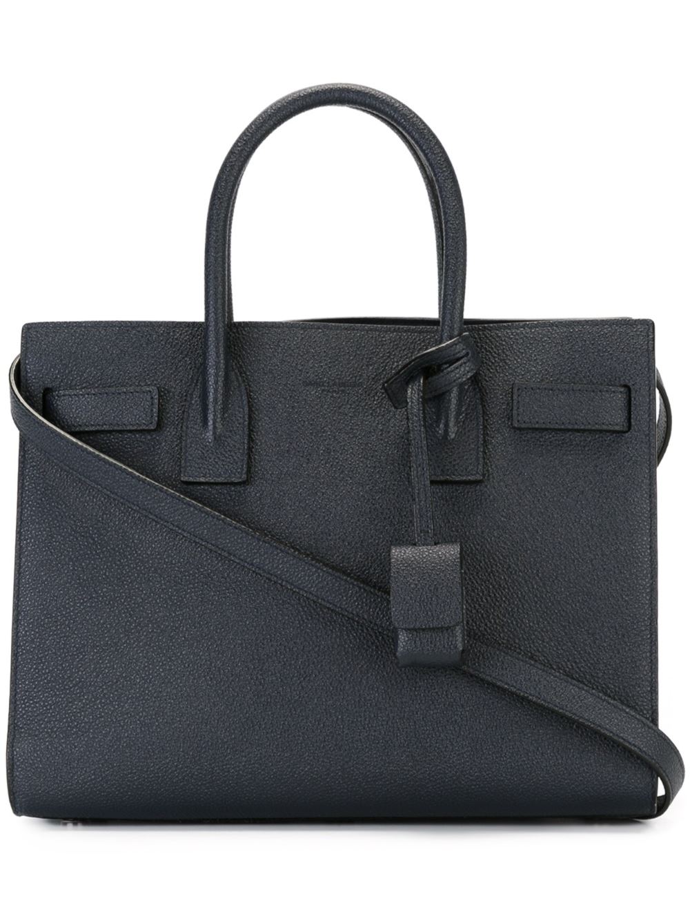 - Saint Laurent 蓝色 牛皮 'Sac de Jour'baby手提包。 顶部有弧状手柄, 正中有品牌标记, 皮质吊牌, 可拆卸可调肩带, 铜炮色五金配件, 双边可延展, 内置拉链夹层, 脚钉。