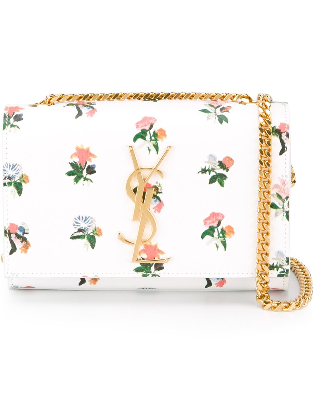 - Saint Laurent 白色 小牛皮 'Monogram'小号单肩包。 长方形, 翻盖饰有插入式的摁扣, 金色标牌, 金色铁链肩带, 花卉印花。