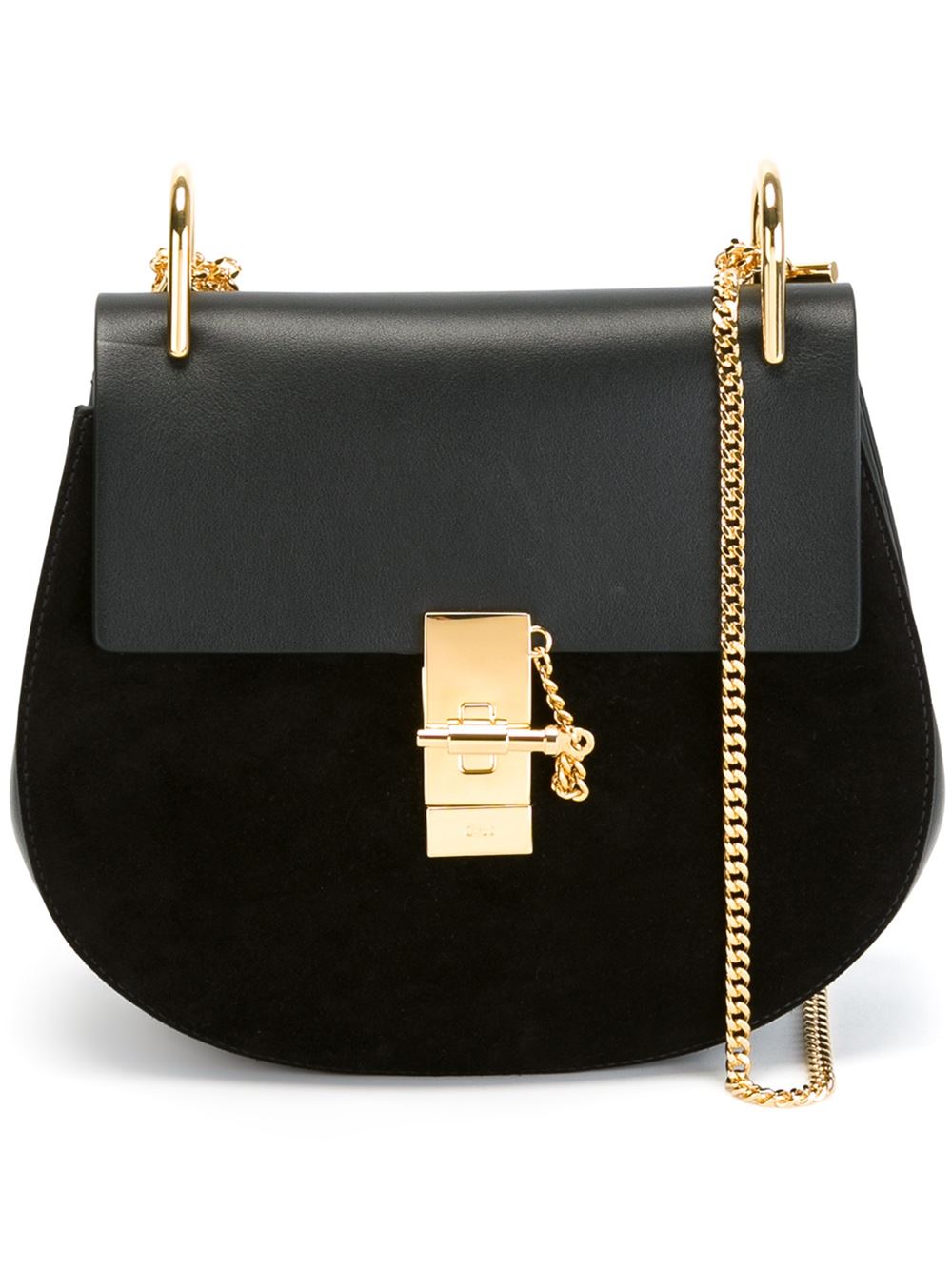- Chloé 黑色 小牛皮与绒面皮 'Drew'单肩包。 翻盖饰有插入式的摁扣, 金色五金配件, 正面饰有浮雕品牌标记, 金色铁链肩带, 内置贴袋。