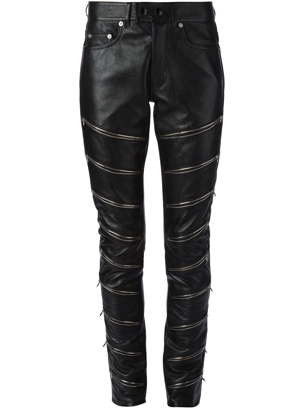 - Saint Laurent 黑色 小羊皮 拉链饰紧身裤。 超窄腿, 纽扣与拉链开合, 腰带袢, 五口袋设计。