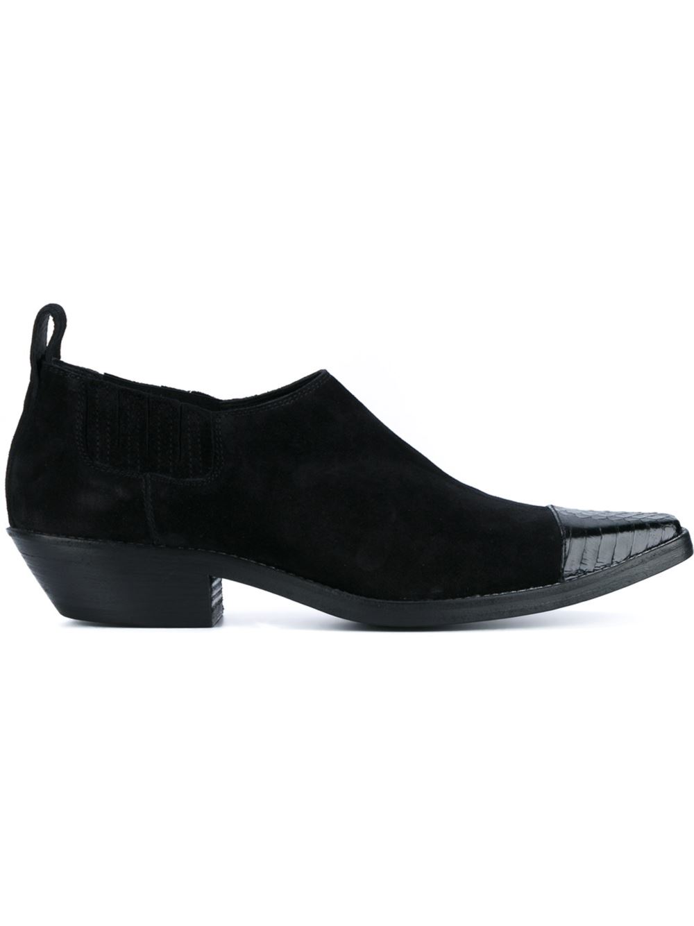 - Haider Ackermann 黑色 绒面皮与牛皮 方头及踝靴。 后置提鞋环, 蛇纹效果拼接, 粗低跟。